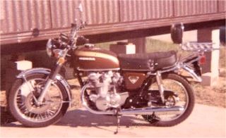 Wild Motorcycle Tales Here's a great story from Jeff Ross. Got your own story? Send it to me. Riding, Icing & Sliding This takes place in December 1972 while I was stationed at Ft Hood Texas and about 19 years old. Back then you had to wear a helmet in Texas. I remember this incident very well, have not exaggerated or embellished it, and I even remember the names of the other riders. It was a Sunday afternoon, and myself and three friends were returning from the weekend in Dallas. I was solo on my CB 450 in the rear, with John W. on a CB 350 Scrambler (driver and passenger) and Kenny N. on a CB 500 solo up front. We drove those little things everywhere; they seemed like real road machines then. Normally no problem. This day however there was a sudden severe storm developing and we were on I-35 South refusing to exercise good judgment and stop. One of those deals where the temperature drops 30 degrees in a couple hours. It was raining turning to sleet and the temperatures were dropping rapidly but we were cold and wet and so decided to push on and get back because really there was no other good option, or so it seemed at the time. Driving very carefully of course, can you believe this? Sound like a typical recipe for disaster? "Duh!" had not been invented yet. Icing began just south of Waco. The helmets with face shields were at least keeping our faces from freezing. The daytime speed limit then was 70, and we were doing at least 50. Somewhere just short of Temple, spaced out and running with the flow of traffic, the CB 500 was going over a bridge (just a culvert overpass really) and just went down before my eyes. Boom! Wow! It happened so fast - no skid - it seemed like it just collapsed. Next the 350, with passenger, went down. Oh-Oh . . . No time to brake or swerve (plus I was numb from the cold), physics was totally in charge. As soon as I hit the bridge down I went too. So there we are, four people, three bikes, sliding down the bridge on a sheet of ice like glass. This is a problem yes, but the potential bigger problem was, as I noticed as I went round and round on my back, the semi bearing down on us from the rear, and cars behind him sliding all over trying to get control. As I am spinning round on the ice, I am watching the driver of the cab-over semi sliding left and right across both lanes, heaving on the wheel and trying to slow it down without jack-knifing. I experienced that slow motion effect. I was trying to kinda swim a backstroke on the ice in desperate attempt to get to the shoulder - but just kept going straight along with the rest of the pack. The things you do when you are faced with do or die . . . We slid along for what seemed like forever, finally stopping spread out across the two lanes. The bikes slid a bit further than we did. Somehow, the truck and the cars behind were able to stop just past the end of the bridge where we all came to a halt. The trucker certainly did a fantastic job in controlling that rig. We immediately jumped up and dragged the bikes off the road - wasn't hard at all. The trucker took off straight away as he didn't want to get rear ended. A state trooper (DPS) showed up in about 45 minutes as we stood there forlornly freezing, had us sit in the cruiser to get warm, and he had the base call a couple friends of his who had pick-ups to come get us as all we had a few bucks between us; a towing service was out of the question. Now this is what still amazes me to this day. It was so icy on that bridge . . . How icy was it? Well it was so icy that there was not so much as a scraped turn signal or handlebar grip or peg on any of the bikes. Our clothes - other than being wet you could not tell we had been sliding along the road - and nobody even had a bump or a bruise. In fact the trooper just assumed we had stopped out of good sense and was amazed when we told him what had happened. Also, my friends had never noticed the semi until it was over as they were not spinning like I was and never thought to look behind. I did learn from that experience to watch bridges in general for icing, not to drive motorcycles in icing conditions, and I still wear a helmet to this day, which in 1975 I am convinced saved me from a severe head injury. That is another story . . . PS: This this is the only picture I have of the 450. -- Jeff Ross (Bonedoggy)