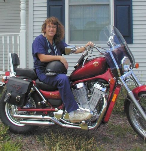 This is my 1994 Suzuki Intruder. I am a home care nurse, and I ride to see my patients on my bike (OK, I don't really wear scrubs and my stethoscope - that was posed to get the point across. And I do wear boots and a full face helmet when I ride). The picture was taken to "shadow" a picture of Mary Breckenridge, an early public health nurse that saw patients on horseback. My patients, the little old ladies, get such a kick out of it - "You AREN'T the nurse, are you?" and I chime in, "Oh, yes I AM." I am also a college nursing professor, and an instructor for the PA Motorcycle Safety Program. I'm not your typical soccer mom. I live to ride, ride to breathe. -- Laura