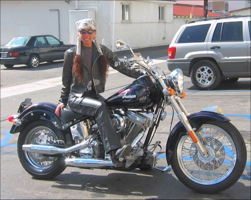 This is "Ananda" (Sanskrit for bliss), my 2002 Indian Scout. It has an S&S 88 Twincam engine and is a 5 speed/beltdrive. Since this picture, I've gotten LOUD pipes (saves lives), heated grips (before you laugh at me can you say that you ride ironbutts, in the rain, cross country trips, have gone over 100 mph, and or have "cold hands/warm heart"?) A cool little feature is the Indian face on my fender lights up! -- K. Lee Kappmeier