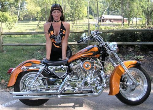 This is my 1996 Harley-Davidson 883 XLH Hugger Sportster, bored out to a 1200. When I bought this bike five years ago, I stripped it down to the bare frame and motor and rebuilt it to fit my personality. All parts are less than three years old and contain the following: Stretched Teardrop Tank, skirted fenders with custom paint by Dave Dush of Newark, Ohio. Kurakyn Hypercharger, 10" pullback drag bars, Iron Horse Bayonet wheels, Dakota Digital Speedo, side-mount license bracket, Wide-glide front end, Le Pera solo seat, HD Flame accessories, teardrop headlight, bullitt signals, 3/4" Samson Long Drags(LOUD) and every piece of CHROME available!