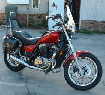 This is my 1985 Honda Shadow VT700C. It has a new seat, cruiser bars, luggage rack, tires (of course), saddle bags, windshield, progressive shocks and some other little stuff. -- Keith Sudano