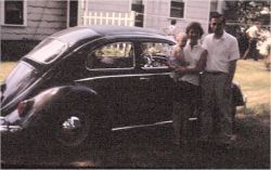 I had a rotational assignment in Massachusetts for the summer and we had to move up there into temporary quarters. Before we left, we took a trip home to Illinois to show off the baby. That's when the picture of the Gray Bug was taken. Then we rented a U-Haul trailer and pulled it up to Massachusetts with no problem. Our son, who was one year old at the time, was placed in a car seat that was hooked over the rear seat. This was before mandatory seat belts or child restraints had even been thought of. On the trip back, we rented a different U-Haul. This one was bigger and it was probably too much for the bug. You could hear the metal creaking as it pulled the trailer up hills. I was afraid the whole thing was coming apart. We also took it home to Illinois at Thanksgiving once with two kids. We just put a piece of paneling over the backseat, covered it with a blanket and stuffed a few pillows around the outside. We put our suitcases in the window well and under the front hood (the trunk area) and plopped the kids in the seat. After a 2000 mile round-trip that included a snowstorm, we arrived back safely in New Jersey but the car looked like a gray snowball. The VW's sunroof was great for carrying long objects. We used it to transport our Christmas tree home. We saw other VW owners doing the same thing. It just had great utility. When we began looking for our first house, we drove it all over Central Jersey with the two kids. Once, I decided to spend a Saturday going out on my own to look at houses and because it was raining, I left the family at home. As I approached a particularly busy intersection, I became aware that the traffic ahead of me was stopping rapidly and several collisions in front of me were occurring. I had almost stopped the Gray Bug when I glanced in my rearview mirror and saw the huge Buick bearing down on me. It hit the Bug at 45 m.p.h. and apparently never saw me. The Bug was dead, crushed from both ends as the Buick pushed it into the car in front of me. I remember the seat flying backwards pinning itself against the rear seat. If my kids had been in that seat, some serious leg damage might have occurred. I learned later that the root cause of the accidents had been a fatal motorcycle crash a quarter mile ahead of me. I went to the junkyard to see the Gray Bug one more time and wondered if I'd get another Bug someday. Now, Read Part 3 to see how a Blue Bug entered my life and taught me how to run out of gas and not need to go to a gas station. Later, read about my White Bug and how three teenage drivers are more than any Bug can handle.