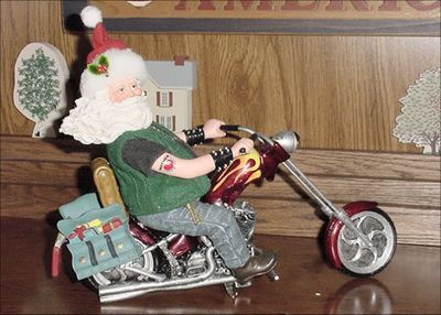 Motorcycle Santa couldn't believe his eyes. He took his coat off, put his leg over the seat, switched on the ignition, put it in neutral, and pushed the start button. "Vroom, vroom, vroom" it went as he twisted the throttle.