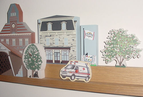 "Hmmm, hmmm, lot's of stuff out here in the hallway that could conceal the piece," said Santa. "Nice collection of Cat's Meow pieces next to the front door. I remember bringing your Nana a few over the years. Wait. That looks out of place. It is out of place. There's an ambulance piece up there on the shelf. That's the eighth piece. My puzzle board only has one more piece to go. Got any more hints Elizabeth?"