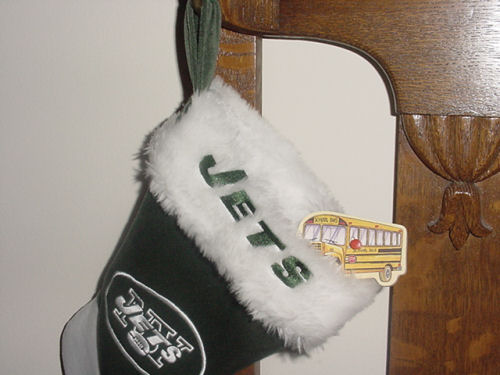 As he passed the hall stand, he saw a green Jets Football Christmas stocking hanging on a hook. Sticking out of the stocking was the ninth puzzle piece, a school bus.