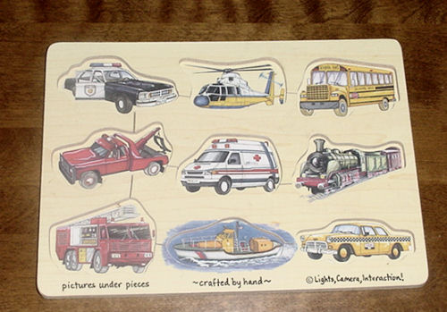 The puzzle was a wooden board with cutouts. Each cutout contained a puzzle piece that was a form of transportation like a train, bus, or boat. Each piece had a red tab on it so the piece could be lifted out of the cutout. This was a great game for little kids from two to five but it was a bit simple for Elizabeth. The idea was to dump out the nine pieces and then pick them up and fit them into the correct openings. On the bottom of the cutouts on the board were the same pictures that were on the pieces. All you had to do was match up the pictures and slip the piece into the opening so it would fit.