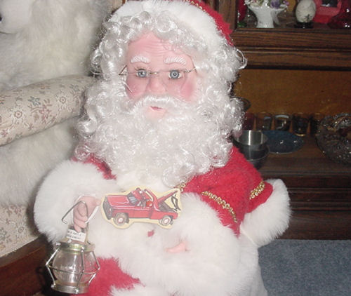 Motorcycle Santa still had to find eight more pieces. The light was a little dim in the room and he looked more intently around the room. He crossed toward a large animated figure of Santa riding a polar bear. It was right next to an antique chair that had been placed next to the Christmas tree.
